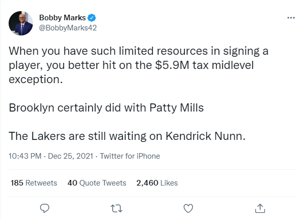 The impact of signing of Mills under the constrains the Nets put on themselves by going the Super Team route is nothing short of incredible. Former Nets executive turned ESPN powerhouse Bobby Marks said it best here: